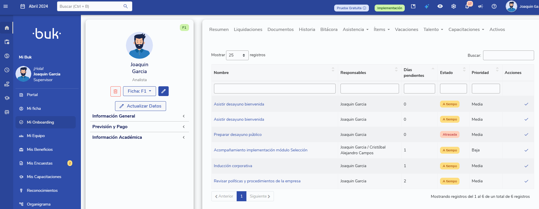 El colaborador puede ver su onboarding desde su ficha, donde encontrará las tareas que le fueron asignadas y el avance de su proceso.