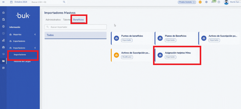 Carga masiva: Regresa a Reportería > Importadores > Beneficios > Asignación tarjetas MINU y sube tu archivo completado.