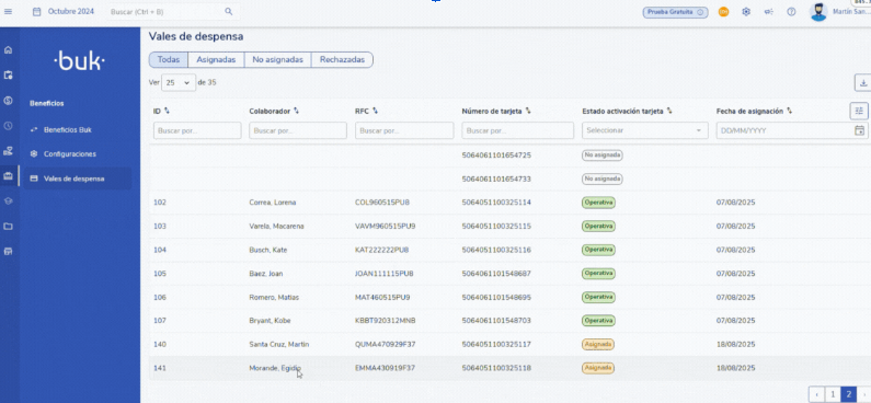 Verificación de estado: Una vez finalizada la carga, podrás validar que el proceso fue exitoso desde la vista de Beneficios > Vales de despensa. El estado de las tarjetas que será visible será de "Asignada".