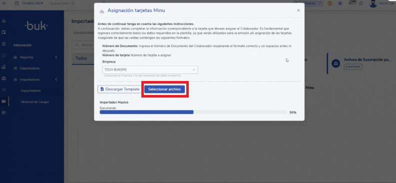 Descarga de la plantilla: Ve a Reportería > Importadores > Beneficios > Asignación tarjetas MINU. Una vez ahí, descarga el formato (template) desde la vista del importador.