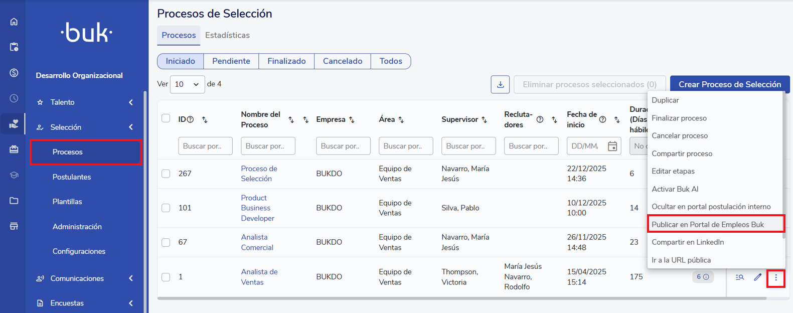 Ahora, para publicar un proceso debes ir a Desarrollo Organizacional > Selección > Procesos donde se visualizan todos los procesos. Acá ve al botón de acciones ( ⠇) del proceso a publicar y selecciona la opción Publicar en el Portal de Empleos Buk.