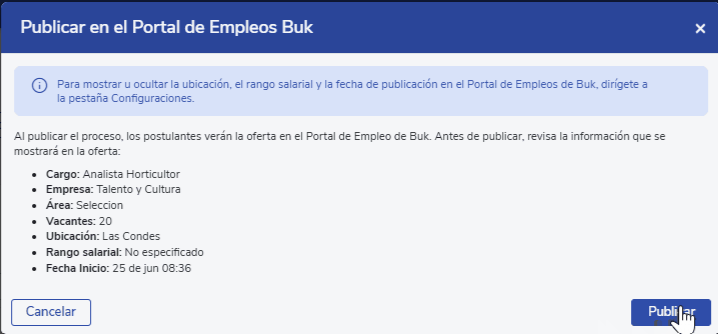 Esto abrirá una ventana emergente que te mostrará la información a publicar del proceso, antes de realizar esta acción. Una vez que apretes "publicar" en este mensaje, la vacante quedará visible para los candidatos en tu portal, permitiendo revisar los detalles y enviar sus postulaciones.