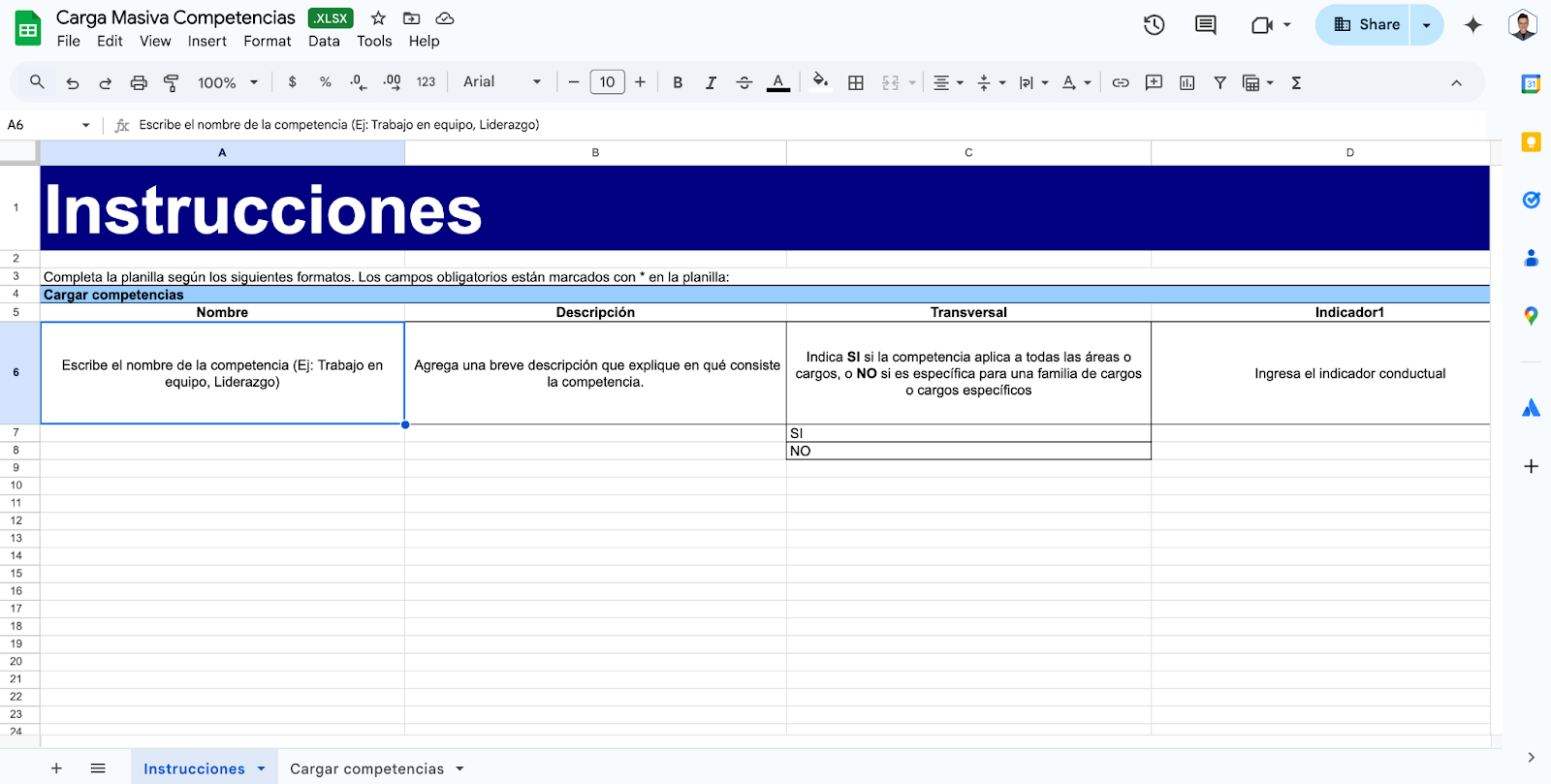 Para cadastrar competências de forma massiva, você deve utilizar um arquivo Excel que pode ser baixado da plataforma.
