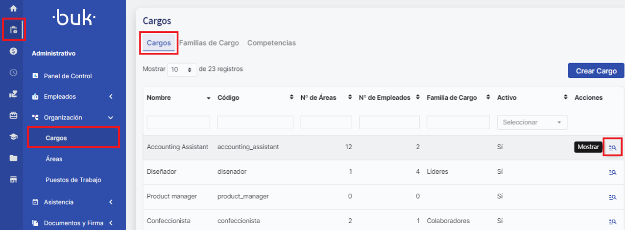 Para atribuir competências aos cargos em sua organização após ter concluído o Manual de Competências, vá para a seção "Organização" e depois selecione "Cargos". Em seguida, clique em "Mostrar".