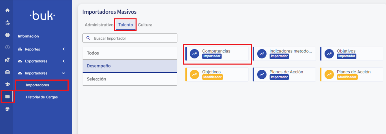 Você também pode cadastrar competências de maneira massiva utilizando os importadores. Para isso, vá até a seção "Informações" e selecione "Importadores". Na aba "Talento", você encontrará o importador específico para "Competências".
