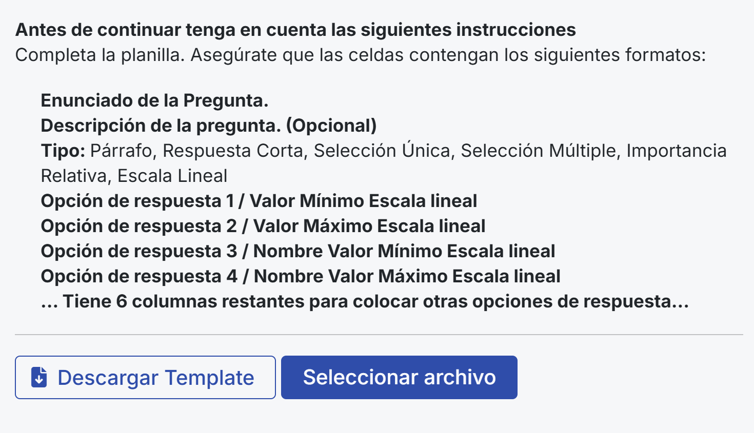 Isso abrirá uma janela com instruções detalhadas. Para continuar, baixe o template clicando em “Baixar template”. Será baixado um arquivo Excel que você deverá preencher com as perguntas que deseja incluir.