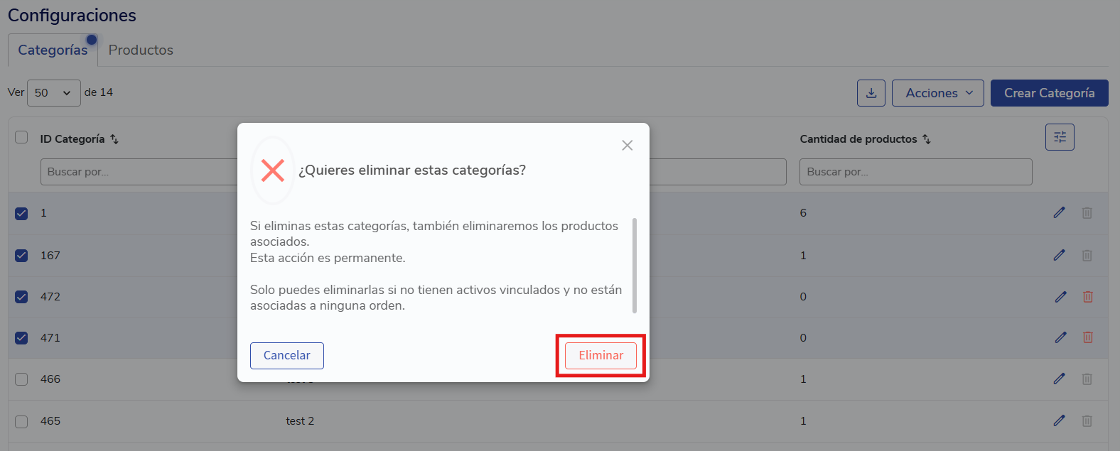 Para excluir categorias em massa você deve: