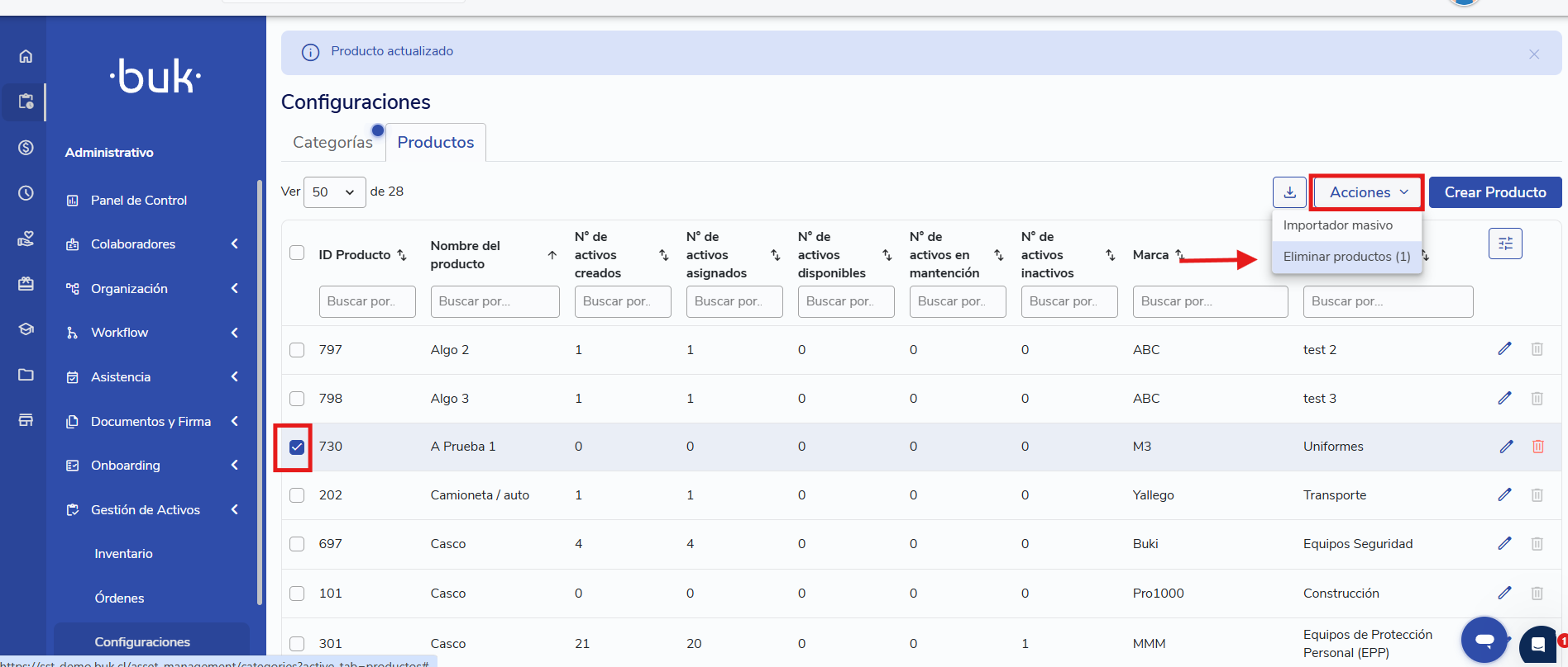 - Selecione os produtos a serem excluídos. Depois clique em Ações > Excluir Produtos.