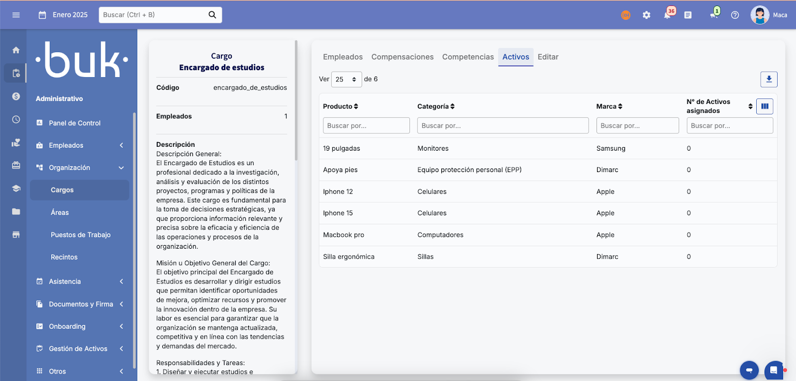 - Ao clicar na aba de Ativos, serão listados todos os Produtos associados junto com a informação de quantos ativos estão atribuídos a esse cargo.