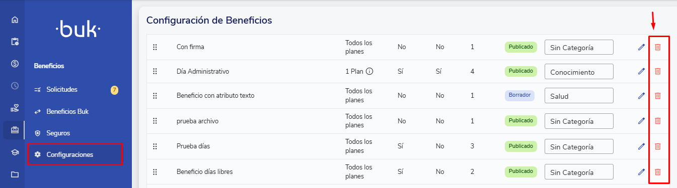Os benefícios são excluídos na seção "Configurações" do módulo de benefícios.