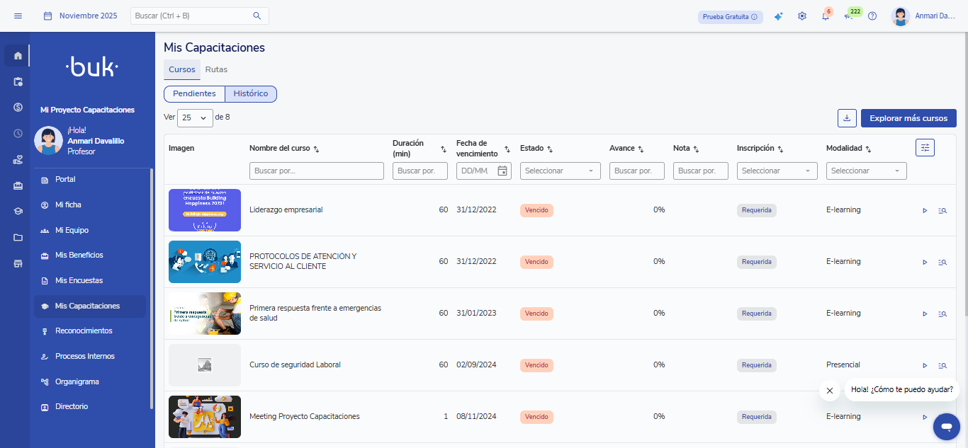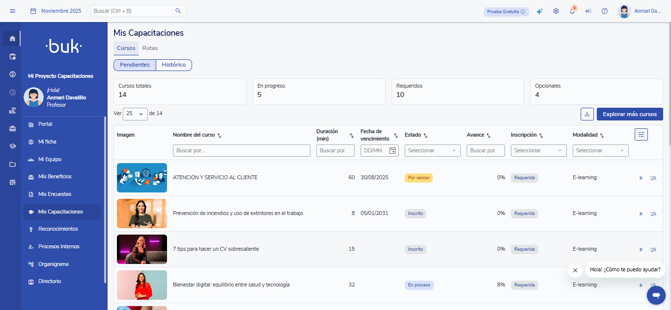Para acessar, você deve selecionar “Mi Buk” no menu lateral esquerdo e, em seguida, clicar em "Minhas Capacitações".
