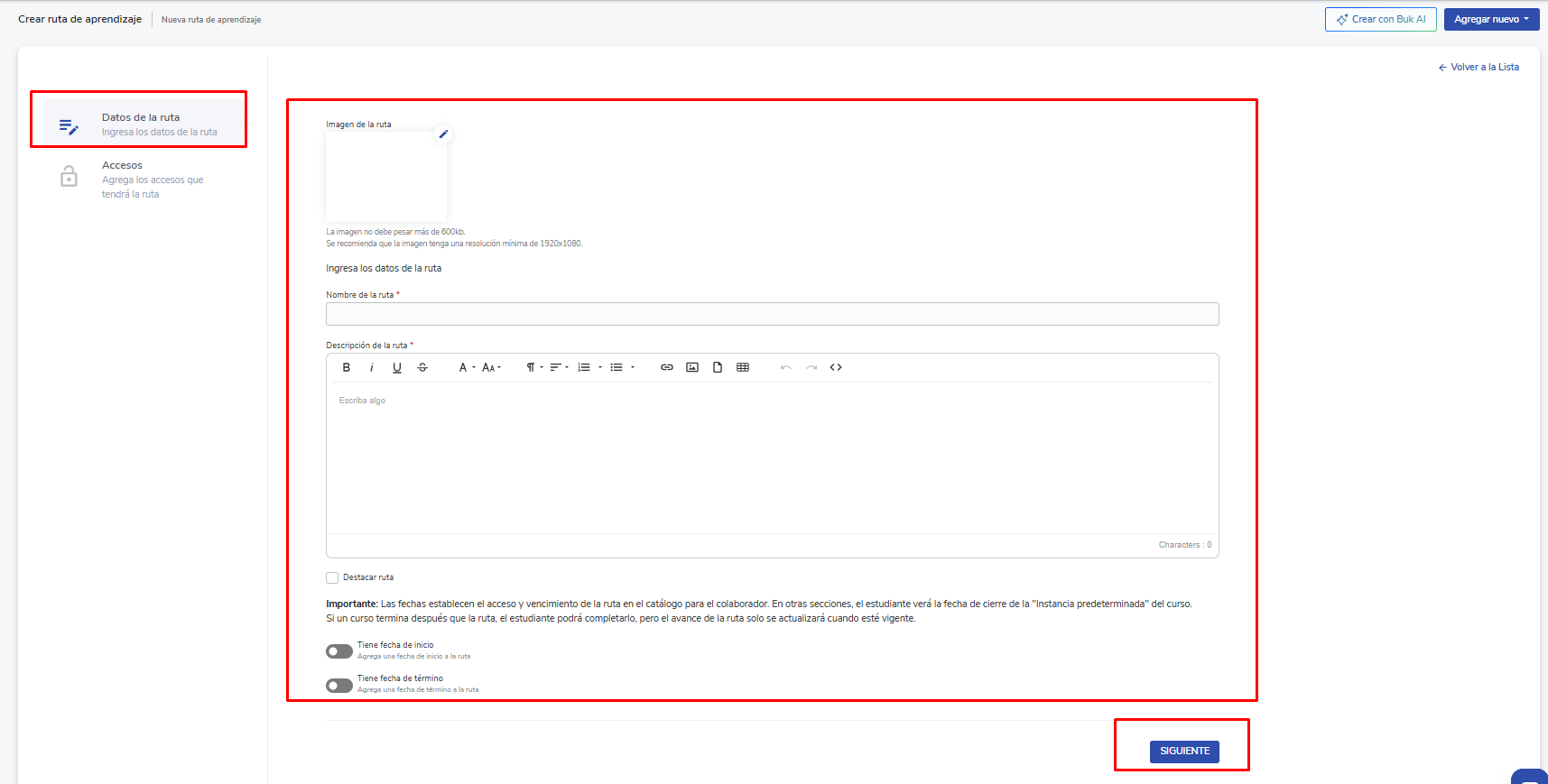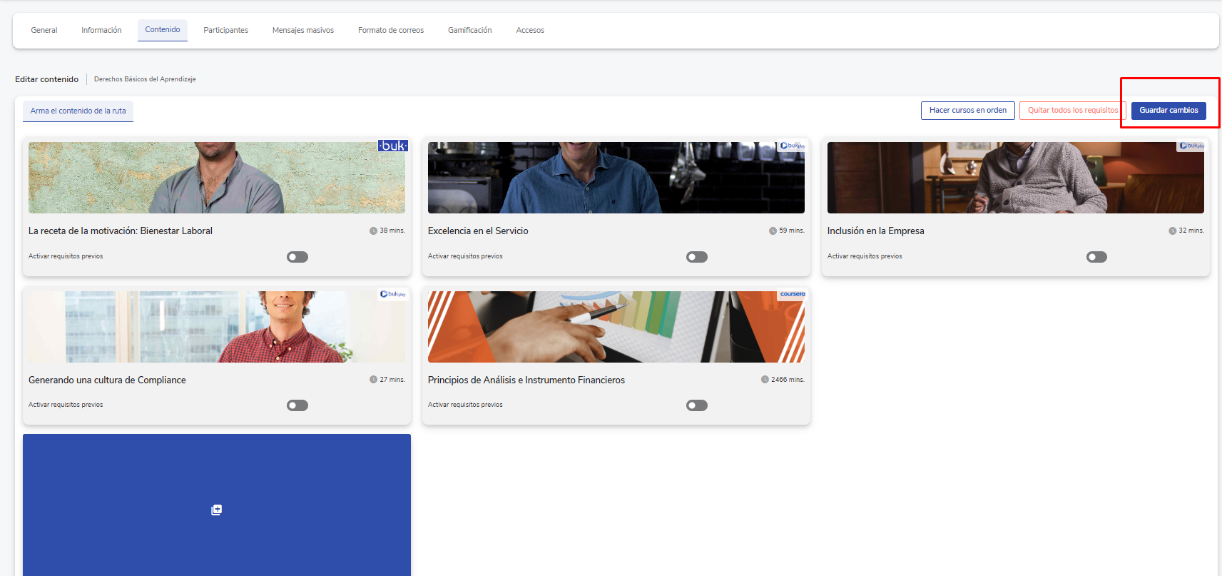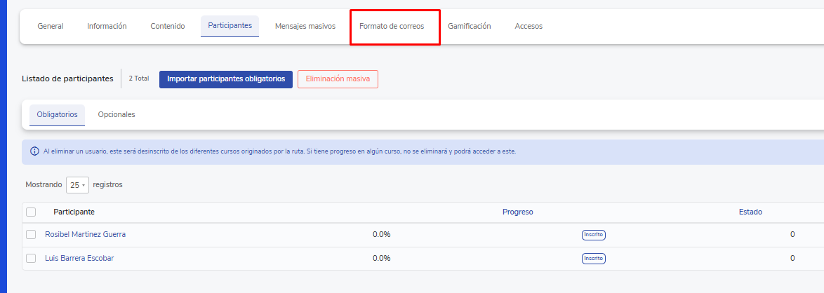Este artigo apresenta um guia passo a passo sobre a criação de uma rota de aprendizagem na plataforma LMS. Inclui desde a configuração inicial, a seleção de cursos e a atribuição de participantes, até a personalização de e-mails, regras de inscrição e gamificação. Tenha em conta que algumas funções, como o envio automático de e-mails ou a inscrição por regras, requerem configurações prévias como campos ou categorías personalizadas no módulo de Configuración general. Apenas os usuários com os papéis súper administrador y administrador podem criar rotas de aprendizagem.