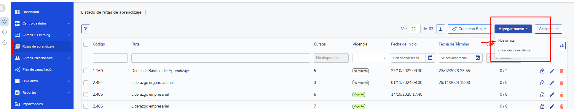 Nota: Se precisarduplicar uma rota de aprendizagemjá criada, use a opção "Criar a partir de existente" após clicar em "Adicionar novo". Em seguida, selecione a rota que deseja copiar. Essa ação replicará tanto as informações gerais quanto o conteúdo da rota original.