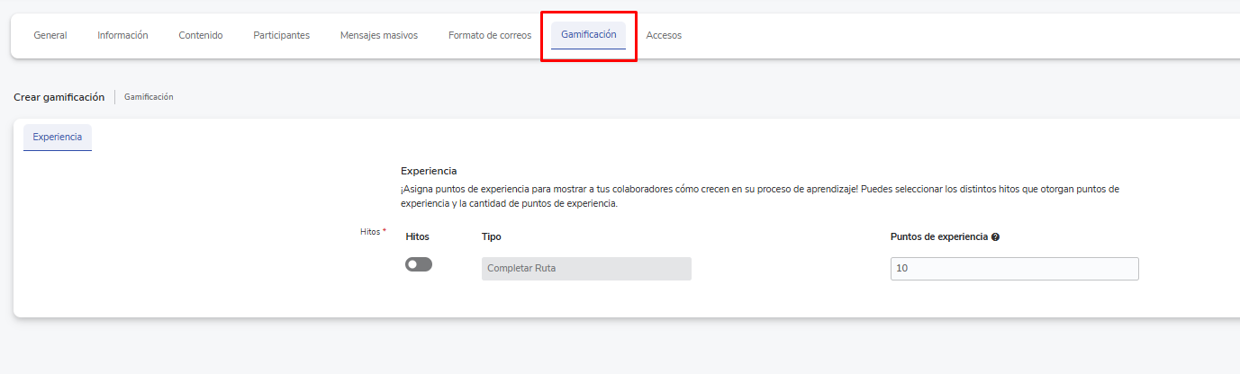 Ative o marcoCompletar rutana abaGamificaçãopara atribuir pontos de experiência quando os colaboradores finalizarem a rota de aprendizagem.