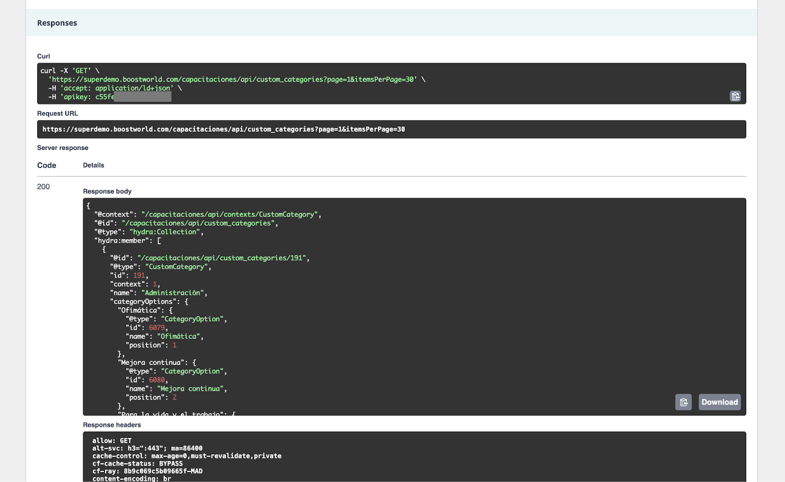 Agora que você já tem suakeyde acesso, você deve acessar a documentação da API. A documentação é pública e você pode acessá-la através da URL da empresa seguida por/capacitaciones/docs. Por exemplo, se sua empresa se chama superdemo e você usa o domínio “boostworld.com”, a URL seria https://superdemo.boostworld.com/capacitaciones/docs. Por outro lado, se sua empresa for Buk e você usar o domínio “buk.cl”, a URL seriahttps://buk.buk.cl/capacitaciones/docs.