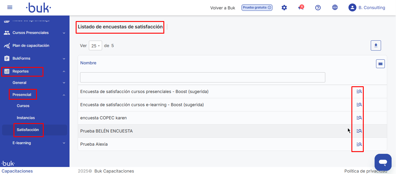 Lá você visualizará um listado com todas as pesquisas de satisfação previamente criadas para cursos presenciais. Desde esta vista podrás: