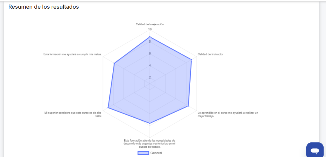 - Resumo dos resultados:É exibido um gráfico comgráfico do tipo radarque mostra o desempenho em cada uma das perguntas aplicadas na avaliação, com sua respectiva taxa de resposta.