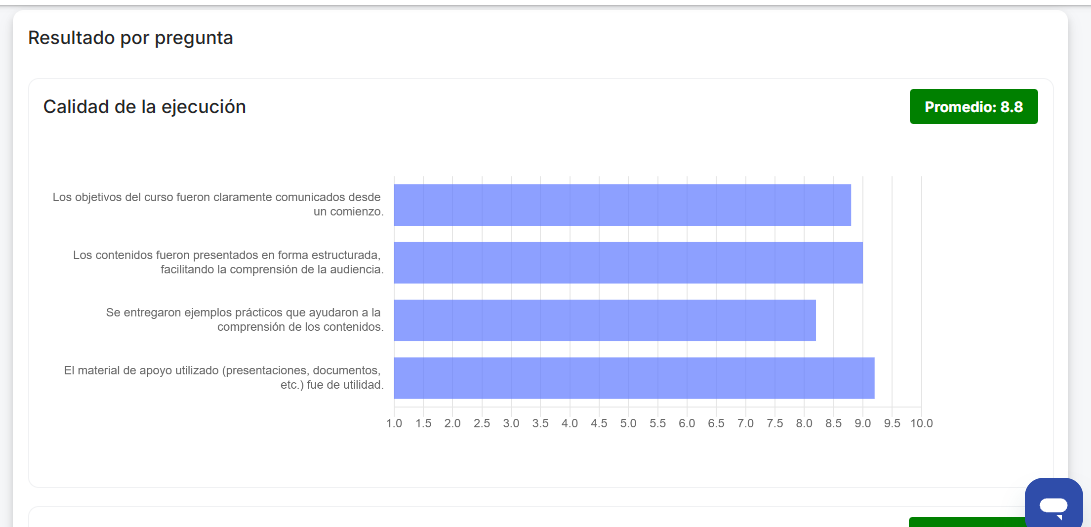 - Índice de satisfacción (mostra a média das respostas em uma escala de 1 a 10).