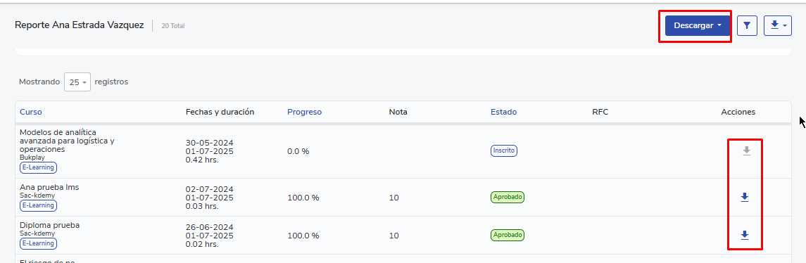 - Para descargar la constancia de un curso específico, haz clic en el ícono de descarga ubicado en la columna “Acciones” y selecciona la opciónConstancia DC-3.