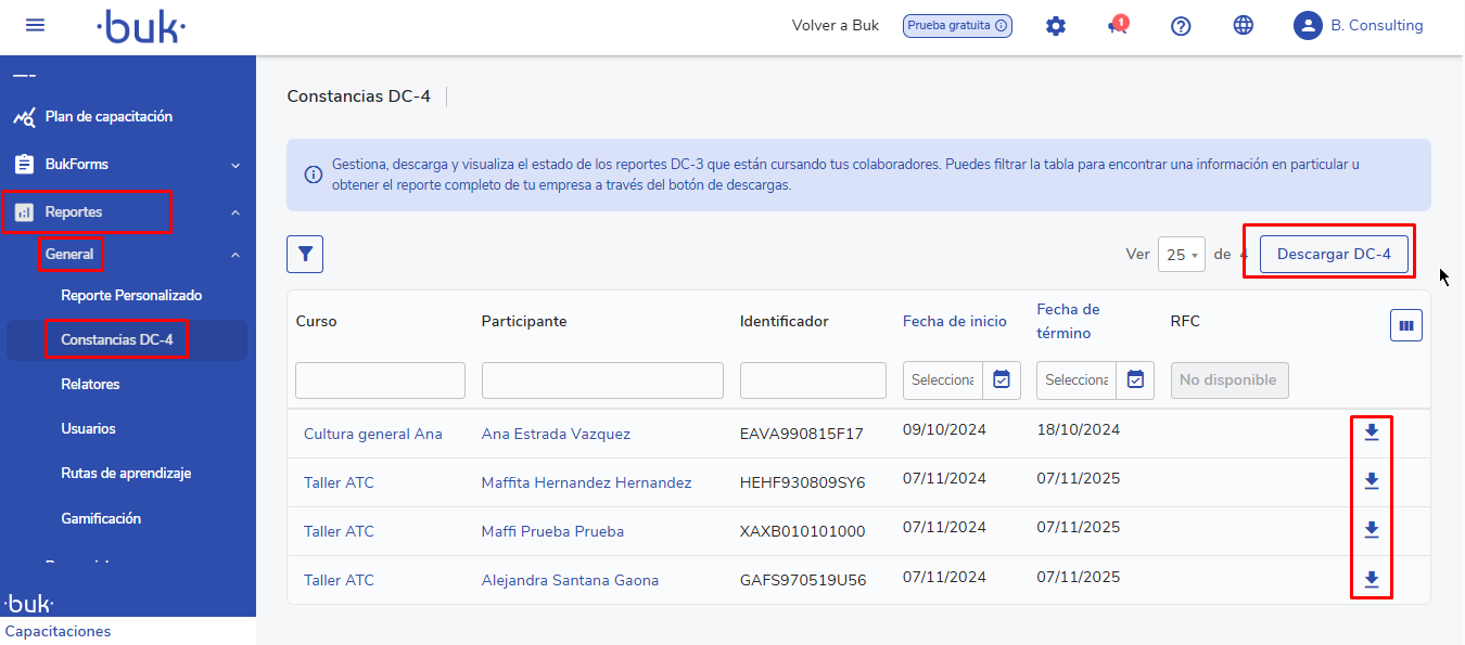 - Generar un reporte consolidado de todas las constancias DC3 emitidas, lo que corresponde alreporte DC4. Para este último, haz clic en el botónDescargar DC4, selecciona el rango de fechas deseado y descarga el archivo.