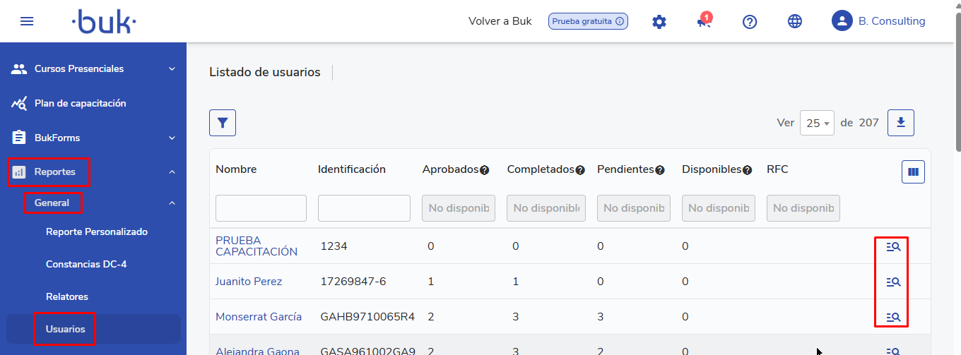 - Para hacerlo, dirígete a la secciónReportesen el menú lateral, seleccionaGeneraly haz clic enUsuarios.