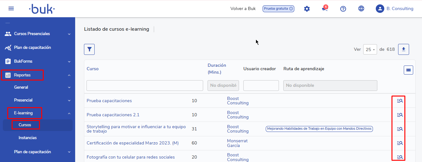 - Para ello, accede al listado de cursos e-learning disponibles dentro de la sección de Reporte y entra al detalle del curso e-learnig correspondiente. Luego, dirígete a la pestañaParticipantes.