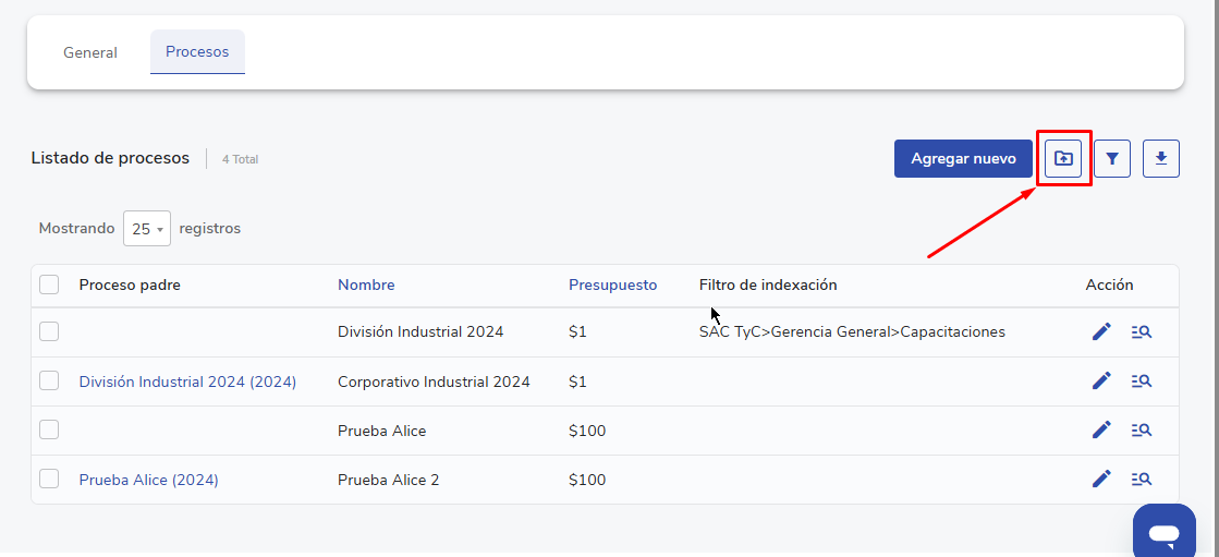 Na vista de processos, clique no ícone de pasta no canto superior direito para acessar acarga massiva.
