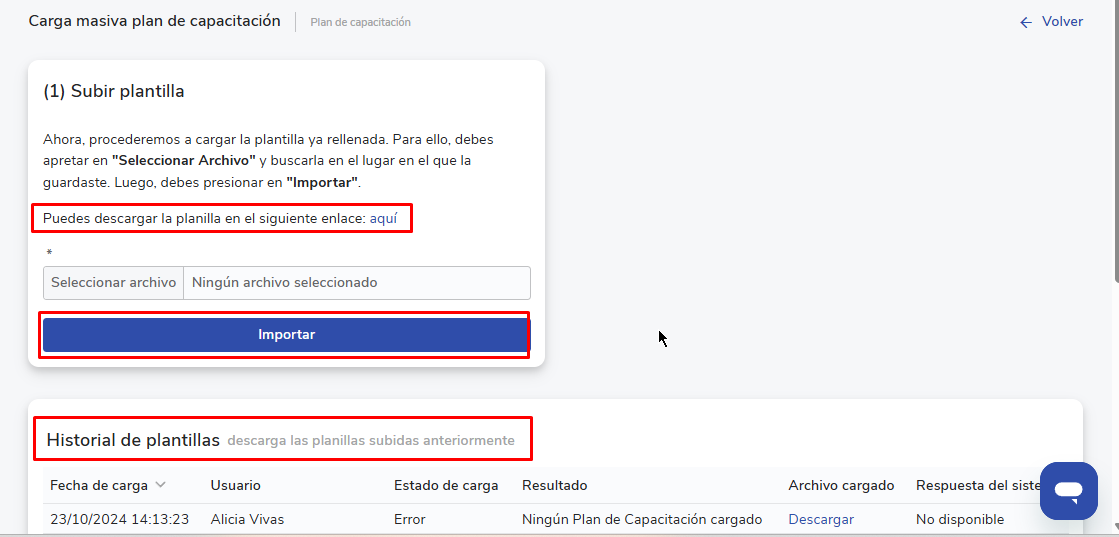 Após a importação, revise o resultado na seçãoHistorial de plantillas. Lá você poderá baixar o arquivo com a coluna “Resposta del sistema” que indica se houve erros e quais itens foram carregados com sucesso.