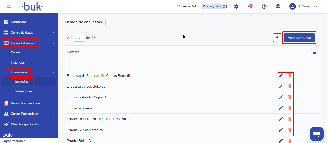 Una vez completada tu encuesta —ya sea manualmente o por carga masiva— haz clic enpara dejarla lista para su uso en los cursos e-learning.