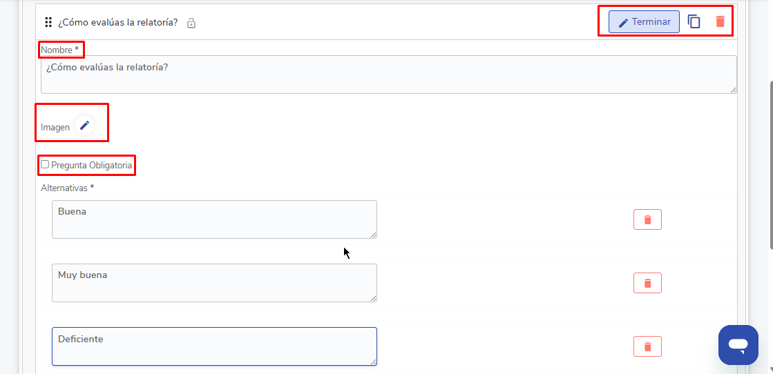 - Agregar, editar o eliminar alternativas (según tipo de pregunta)