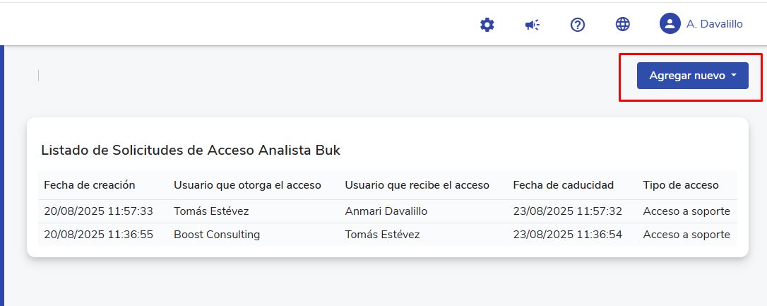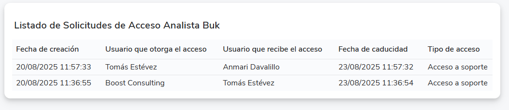 - Você pode ver a lista das Solicitudes de Acceso Analista Buk às quais você concedeu acceso: