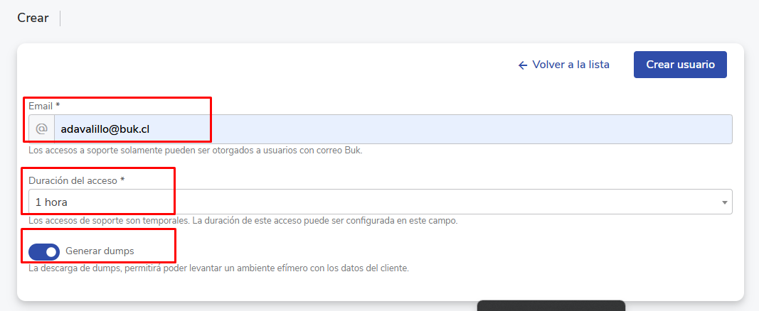 - Gerar dumps:Você deve ativar esta opção quando o seu Agente Buk sugerir, para o acceso ao banco de dados, se necessário.