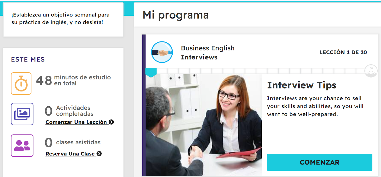 Desde el panel principal podrás ver tu nivel, logros y horas de estudio.