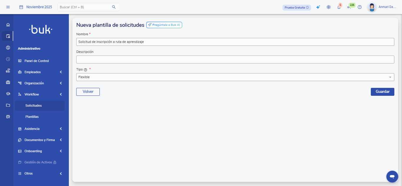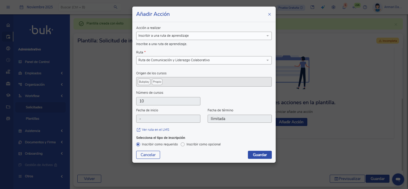 O fluxo émanual, pois se inicia quando um usuário preenche um formulário dentro do Buk, e pode incluiretapas de revisão ou aprovação, como a validación del supervisor, antes de executar a ação final“Inscrever em uma trilha de aprendizagem”.