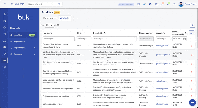 - Se um widget for eliminado a partir databela principal (Reportes → Analítica → Widgets), desaparecerá de todos os dashboards associados ao atualizar a página.